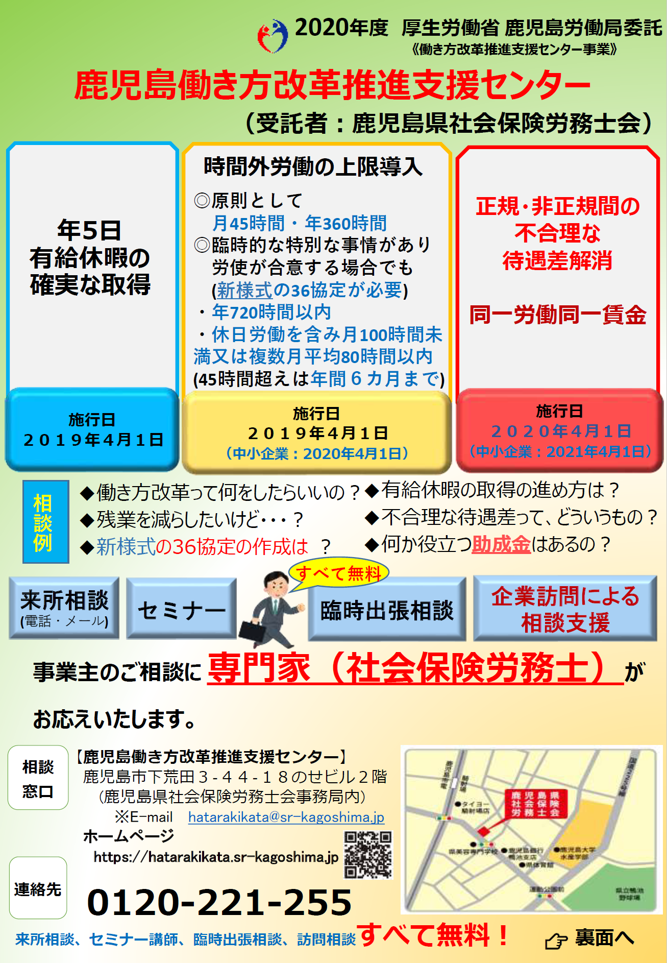 鹿児島労働局、鹿児島県社会保険労務士会より以下の通り鹿児島働き方改革推進支援センターの周知依頼がありました。