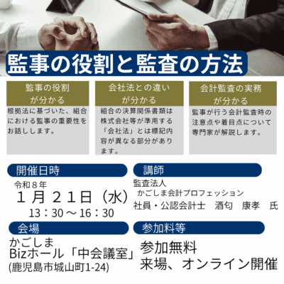 – 開催【R8.1.21開催】「組合自治監査講習会」 新設組合の方や新たな監事に就任された方は必ずご参加ください!今年度も「監事の役割と監査の方法」をテーマに下記のとおり開催いたします!