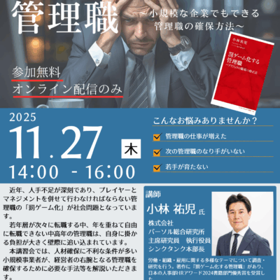 – 開催【R07.11.27開催】「罰ゲーム化する管理職~小規模な企業でもできる管理職の確保方法~」近年、人手不足が深刻であり、プレイヤーとマネジメントを併せて行わなければならない管理職の「罰ゲーム化」が社会問題となっています。
