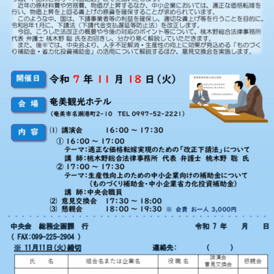 – 開催【R7.11.18開催】(大島地区)地域別交流懇談会中央会では、県下各地域で中小企業の活力強化等を目的とした懇談会を開催していますが、今般、下記のとおり【大島地区】にて実施いたします。