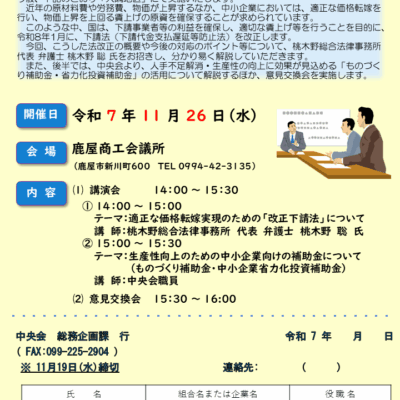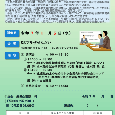 – 開催【R7.11.5開催】(川薩地区)地域別交流懇談会中央会では、県下各地域で中小企業の活力強化等を目的とした懇談会を開催していますが、今般、下記のとおり【川薩地区】にて実施いたします。