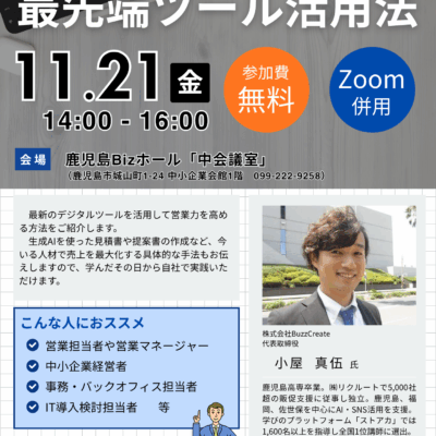 – 開催【R7.11.21開催】ムダを省いて営業力を高める最先端ツール活用法本講習会では、最新のツールを活用して営業力を高める実践的な方法をお伝えします。