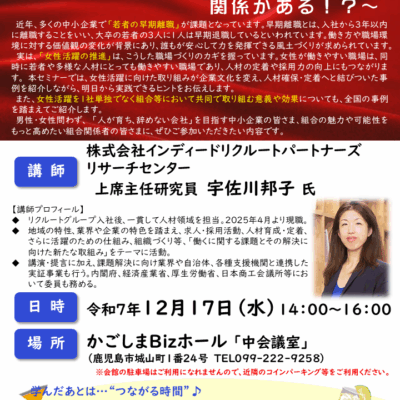 – 開催【R7.12.17開催】「現場を変える“女性の声”~若者の離職防止と女性活躍は関係がある!?~」&「女性のつどい」近年、多くの中小企業で「若者の早期離職」が課題となっています。