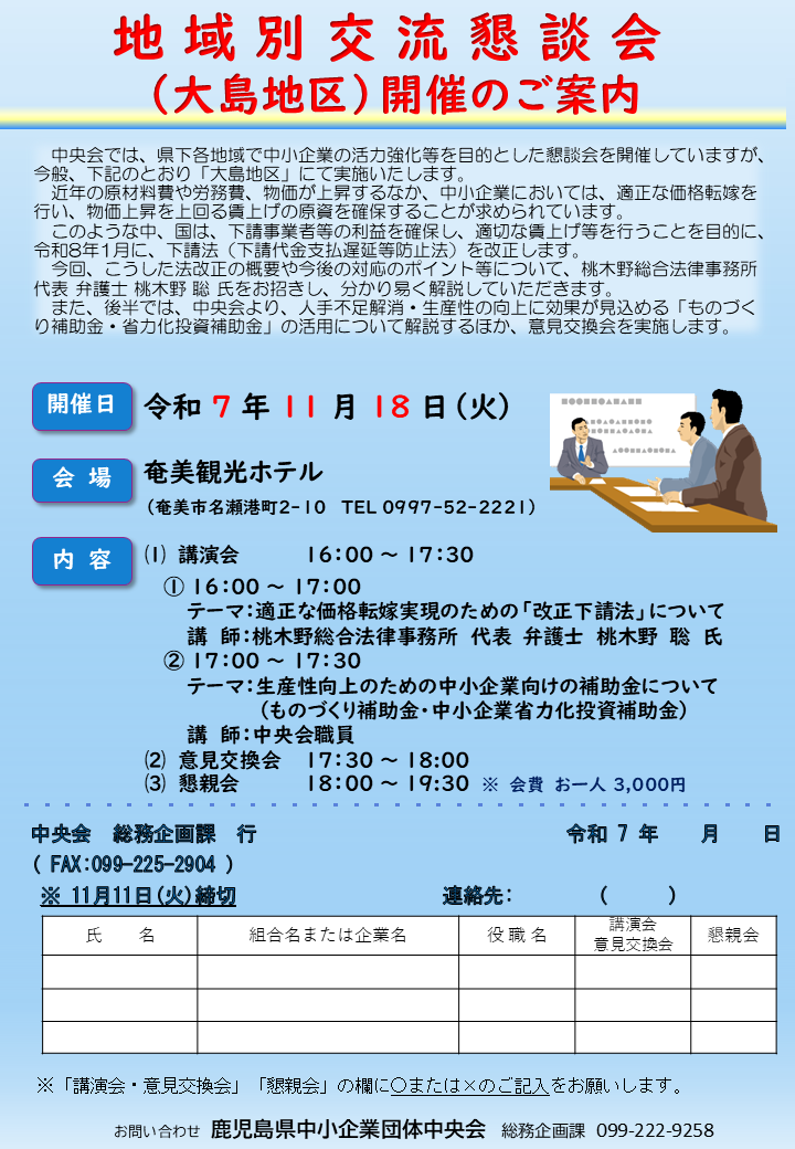 中央会では、県下各地域で中小企業の活力強化等を目的とした懇談会を開催していますが、今般、下記のとおり【大島地区】にて実施いたします。
